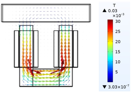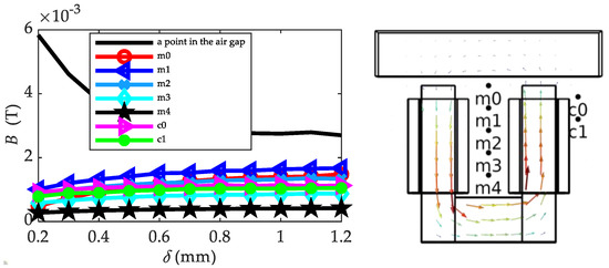 To analyze the leakage inductance, it is necessary to know the distribution of the leakage flux. It is clearly illuminated in Figure 4 that the leakage flux is mainly concentrated in the slot between the two legs of the sensor probe, as well as the outer side of the leg. The flux density at several points (m0, m1, m2, m3, m4, c0, c1) are obtained by FEM, as Figure 5 shows.