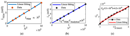 where GS is a defined coefficient to calculate the leakage inductance, and N is the coil turns of the inductive sensor. GS is the slope of the fitting line of LS vs. N2 curve in Figure 7b, and GS = 7.4 × 10−6 here. GS of inductive sensors with different size can be obtained by the same method.