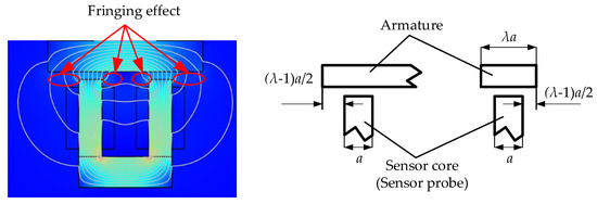 There is a fringing effect [10] at the edge of the sensor probe, as shown in Figure 9. Therefore, the geometric dimension of the armature needs to be considered. Assume that the side length of the sensor core is a, and the side length of the armature is λa. In the process of displacement sensing, the edge of the measured surface of the armature needs to exceed in the transverse direction out of the edge of the sensor probe. This can reduce the error caused by the transverse parasitic motion of the armature in practical application. The rule for selecting geometric dimensions of the armature is determined by considering the fringing effect. As shown in Figure 10, when λ approach to 2, the change trend of sensor inductance with λ slows down, thus we should select λ ≥ 2.