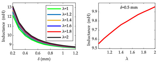Equation (3) is the traditional analytical model for calculating the inductance sensor, and the inductance obtained does not consider the leakage inductance. By adding the Equation (11) to Equation (3), we can obtain a modified analytical model of inductance vs. air gap characteristic: