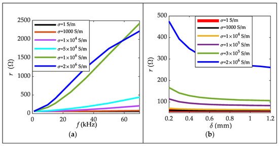 Resistance, core conductivity and excitation frequency of inductive sensors: (a) The variation of resistance with excitation frequency of different core conductivity (δ = 0.2 mm); (b) The variation of resistance with air gap of different core conductivity (f = 15 kHz).