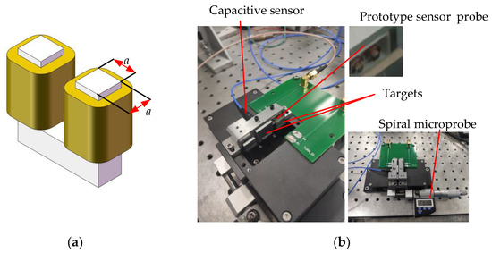 An experimental platform is built as shown in Figure 18b. The target is driven by a spiral microprobe with a resolution of 1 μm. A capacitive sensor (Type: CSH05) supplied by MICRO-EPSILON is used as a reference standard, which has nanoscale resolution. A high-precision impedance analyzer is used to test the impedance of prototype sensors. In addition, a phase lock-in amplifier (Type: LF2LI) provided by Zurich Instruments is used to demodulate the analog signal from the differential inductive sensor.