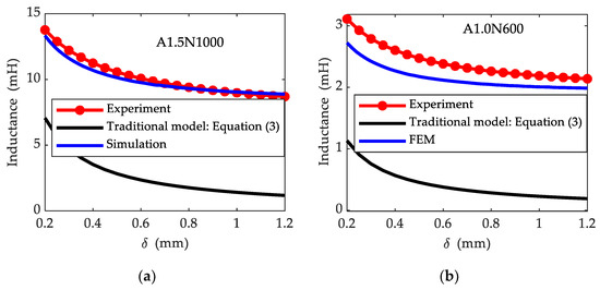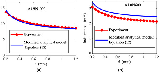 Inductance vs. air gap characteristics of prototype sensors with the excitation frequency of 16 kHz: (a) L-δ characteristic of A1.5N1000; (b) L-δ characteristic of A1.0N600.