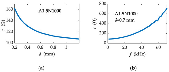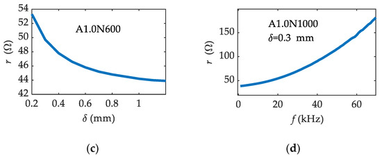 Influence of air gap δ and excitation frequency f on the resistance r of inductive sensors: (a) Relationship between r and δ of A1.5N1000 with the excitation frequency of 16 kHz; (b) Relationship between r and f of A1.5N1000 (δ = 0.7 mm); (c) Relationship between r and δ of A1.0N600 with the excitation frequency of 16 kHz; (d) Relationship between r and f of A1.0N600 (δ = 0.3 mm).
