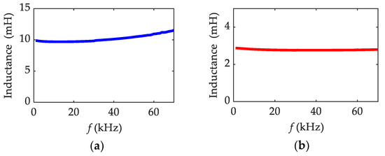 Relationships between inductance and excitation frequency of prototype sensors tested by the high-precision impedance analyzer: (a) A1.5N1000 at δ = 0.7 mm; (b) A1.0N600 at δ = 0.3 mm.