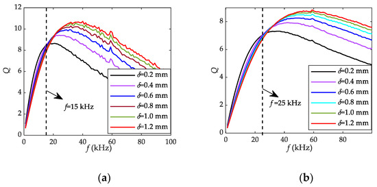 The relationship curve between Q value and excitation frequency of two prototype sensor probes under different air gap: (a) Q vs. f of A1.5N1000; (b) Q vs. f of A1.0N600.
