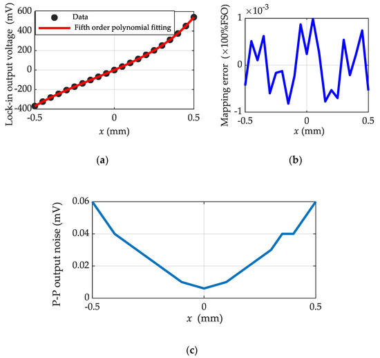 Experimental results of the prototype differential inductive sensor (composed of A1.5N1000): (a) Output voltage vs. x characteristic; (b) Mapping error; (c) Peak to peak output noise.