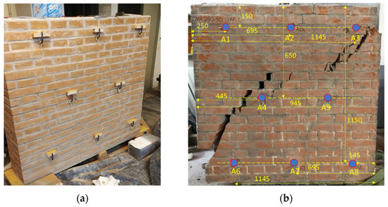 At the end of the wall tests the reinforced plaster was detached, and the masonry showed several major cracks along the diagonal. For the anchor tests, each anchor had a code (A1, A2 … A8) depending on the position within the wall (Figure 1).