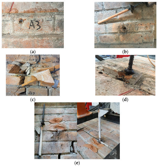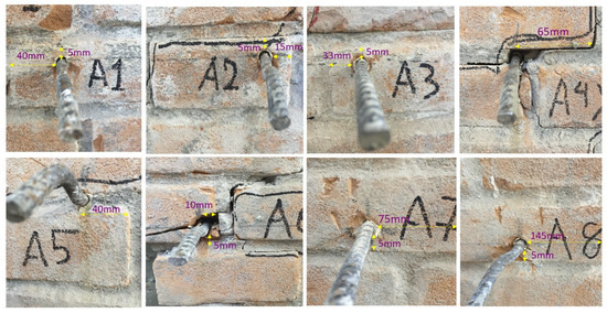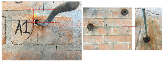 Details of the positioning with respect to the brick/joint are exemplarily shown in Figure 3. After the wall testing phase, most of the anchors were bent (Figure 4) which required additional measures to perform a tension test. In these cases, the anchors were cut just 6 mm above the surface of the masonry and a steel washer and a new bar were welded at the top of the existing bar to be able to perform the anchor pull-out test (Figure 4). In some cases, anchor testing was not possible, because the bent part was too close to or below the masonry surface and welding could not be executed. In other cases, the anchor was already loose because the crack was too large (e.g., along the diagonal of some walls in positions A4 and A6).