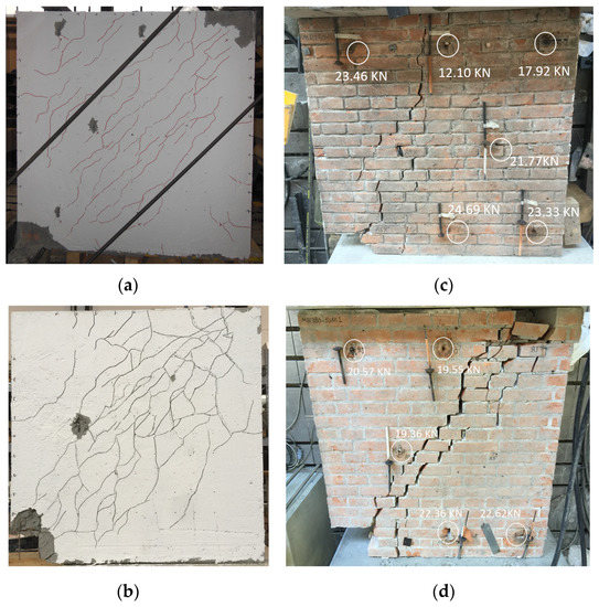Damaged walls: after wall testing ((a) wall W2 and (b) wall W5) and after anchor testing ((c) wall W2 and (d) wall W5) with residual load.