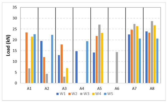 All anchors were tested in or nearby cracks that varied between 0.1 mm and 2.5 mm as reported in Table 1. Anchors seem to be crack inducers. When the walls were cyclically loaded and damaged prior to the anchor tests, it seems that the crack propagation passed through the anchor hole. A couple of examples of the crack width measurements are reported in Figure 7. As expected, the crack width was related to the position within the wall, therefore the anchors close to the diagonal and in the upper part of the wall were in the most severe conditions. This is evident by looking at the walls after the tests (Figure 8) and by collecting the load depending on the position (Figure 9). Figure 8 shows the walls after the cyclic tests (left) and after the removal of the reinforced plaster and the tensile tests (right). In many cases, during the cyclic loading on the walls, the bent part of anchors pushed out the concrete, suggesting that the anchors were subjected to high stresses [40]. This phenomenon was observed along the diagonal (A3 to A6) and in the upper part of the wall (anchor positions A1 and A2).