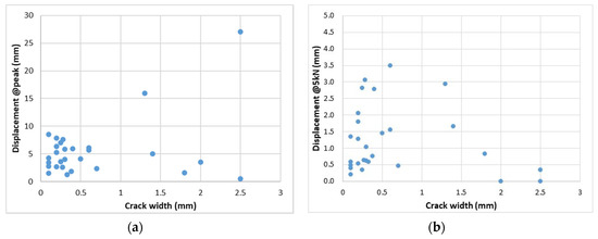 On the basis of the previous analysis, it seems that apart from the position, the crack width affects the results. Figure 10 shows the maximum load vs. the crack width. The load decreases exponentially with the increasing of the crack width with an excellent correlation (R2 = 0.94). It seems that up to the crack width of about 0.7 mm the decrease follows either an exponential (R2 = 0.94) or a linear trend (R2 = 0.92) (Figure 10 right), while beyond that limit the load reduction is less pronounced and only an exponential function can fit the experimental results (Figure 10 left). Unfortunately, there are no results in the crack width range 0.7–1.3 mm, while it would be interesting to observe whether there is a steep change in gradient (at a given crack width) or a soft decrease until reaching an asymptotic value. To investigate this topic a specific additional experimental campaign is needed. On the basis of these results, it seems that the crack opening is the governing parameter that affects the results. Nevertheless, although the correlation between load and crack width is excellent, there is no correlation between displacement and crack width. Indeed, the coefficients of variation of the displacements evaluated at different load levels (Peak load, 50% of the peak load and at 5 kN- Table 3 and Figure 11) are very high. It has to be noted that the displacements at the peak load and at 50% of the peak load were associated to the different loads of each test. Nevertheless, even when evaluated at the same (rather low) load level (5 kN), the coefficients of variation remained very high. The coefficient of variation of the load associated to different crack width (Table 3) is very low up to crack width equal to 0.4 mm.