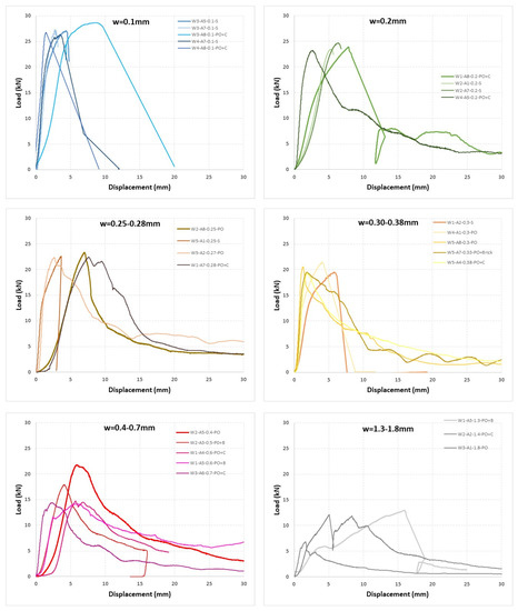 Load-Displacement curves grouped by crack width (Test Code-crack width in mm-type of failure).