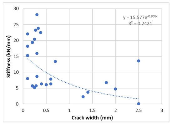 Stiffness of the linear branch of the load-displacement curves vs. crack width.