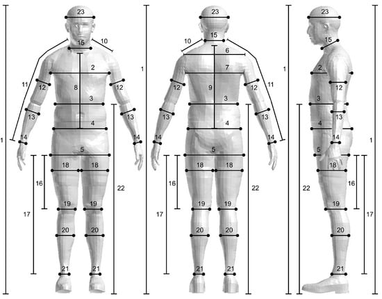 The clothing industry anthropometric dimensions [21,22] as shown in Figure 1 were measured using a tailor measuring tape on the particular body segments, except the body height, which was measured as a rectilinear measurement, when the subject was standing upright by a wall.