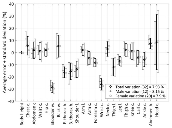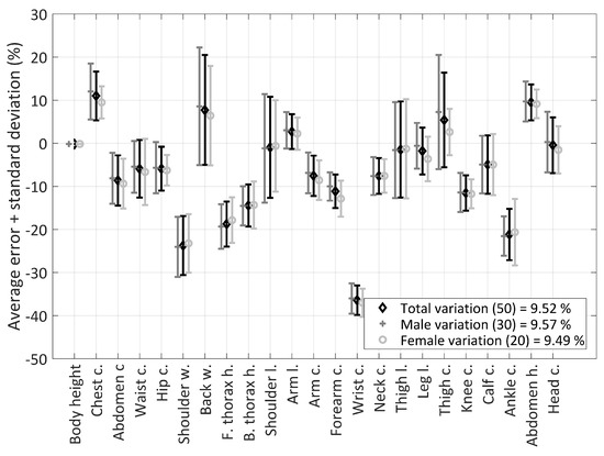 In general, for all groups, the variation was over the average for males, whilst females reported variation under the average. This was probably caused by the anthropometric reference model, which represented both male and female groups, where males were usually more robust compared to females. The lowest variation was usually reached at dimensions that were not affected by the local musculature too much.