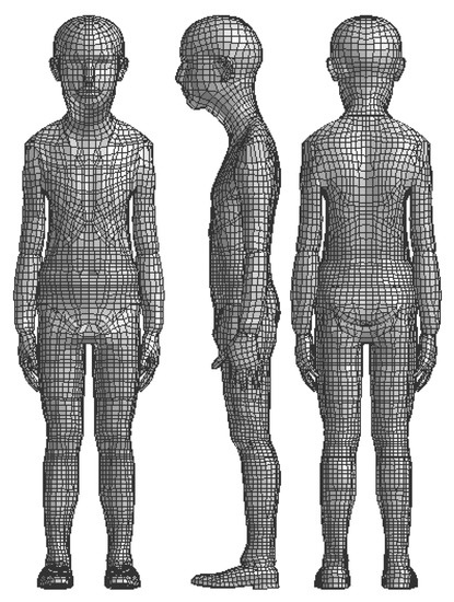 Subject-specific Czech adolescent model. Male, 10 y, 144 cm, 35 kg. Front (left), side (middle), and back (right) views.