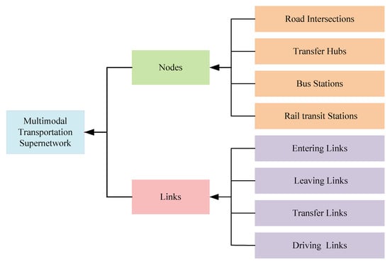 The relationship among the elements in the multimodal transportation super network studied in this paper is shown in Figure 1.