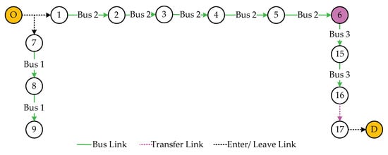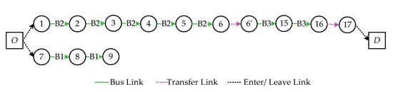 For the first aspect, Wan and Lo studied transit network design problem in the multi-modal network and presented a systematic phase-wise methodology that considering both the effect of congestion and integration of modal transfers []. Moreover, they modeled inter-route and inter-modal transfers through the state augmented multimodal (SAM) network approach. Uchida et al. established a multimodal network design problem model to solve the problem of optimal frequency design for bus services. They applied sensitivity analysis to define linear approximation functions between the Probit SUE link flows and the design parameters, which are then used as constraints in the sub-problem of the NDP instead of the original stochastic user equilibrium (SUE) condition []. Li et al. considered the impact of bike-sharing on transfer, optimized the design problem of the bimodal transit network, and proposed a continuum model to optimize the bimodal transit system and shared bikes in a grid network at the same time [].