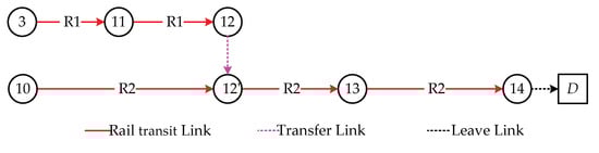 Meanwhile, in the actual transportation system, driving links , indicate adjacent stations, and the travel time of the bus and rail transit driving links are set as: