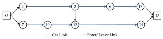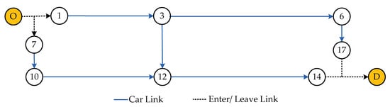 Meanwhile, in the actual transportation system, leaving links () show the process of arriving at the destination, which mostly contains walking time. Hence, the travel time of the leaving links can be described as: