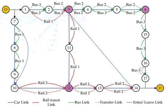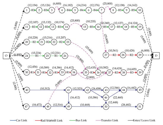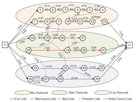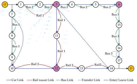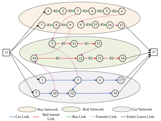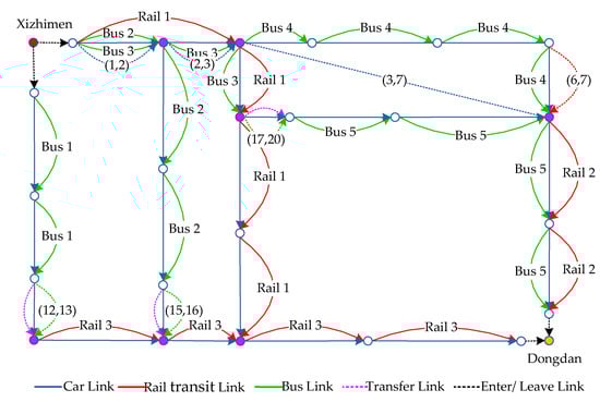In this section, we present a multimodal transportation network that meets two requirements: one expresses the transfer among car, bus and rail transit modes; the other one shows the internal transfer of bus or rail transit mode. As shown in Figure 2, a traveler departs from the origin