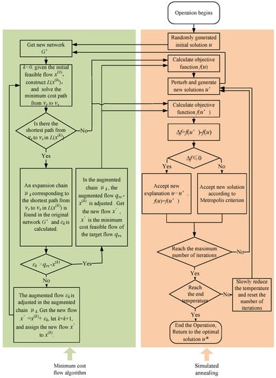 It can be concluded from Table 6 and Figure 14 that the optimal solution of the exact algorithm is (1,3), and the corresponding operation cost is 4114, construction cost is 3000, and total cost is 3557. Some schemes are without values of construction cost and objective function in Table 6. Because the maximum feasible flow of the schemes does not reach = 100, so the optimization schemes are not adopted, and there is no need to calculate the objective function.
