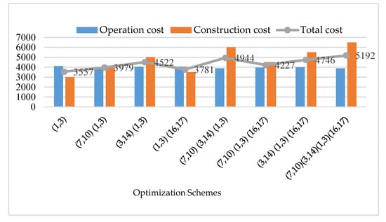 The optimal result of traffic flow assignment in step 2 is used to calculate the value of the network operation cost by Equation (21); then based on the optimization cost and the budget cost of each candidate link to calculate the value of construction cost by Equation (22); finally, the weighted sum of the operation cost and the construction cost by Equation (23) is the value of the objective function. When the generalized cost formula coefficients = 0.25,= 0.25, = 0.25, 0.25 in Equation (1), and the objective function weight coefficients 0.5, 0.5 in Equation (23), the calculation results are illustrated in Table 6 and Figure 14.
