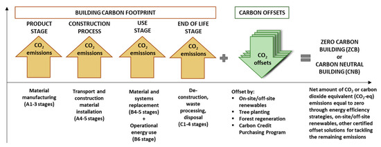 In recent years, efforts to reduce the environmental impacts of the construction sector have led to continuous refinements and upgrades of nearly Zero Energy Building (nZEB) policies towards an even more sustainable building approach: the carbon-neutral building (CNB) or the zero-carbon building (ZCB). Decreasing the carbon footprints of buildings, and increasing the green infrastructures of cities, can be key actions to combat global warming and to meet the Paris Agreement Goal. However, less than 1% of the buildings in the world may currently be labelled as “carbon-neutral” [1,2]. The massive use of resources, and the related environmental impacts, are evident in the construction sector that, in 2018, globally accounted for 36% of final energy use, and 39% of energy and process-related carbon dioxide (CO2) emissions. In particular, 11% of the emissions resulted from manufacturing building materials and products, such as steel, cement, and glass, and 28% resulted from building operations [3,4]. For this reason, a carbon-neutral approach has been adopted in several countries and regions as a governmental climate change strategy [5]. A roadmap for moving to a competitive low-carbon economy by 2050 has been set by the European Commission since 2011 [6], while, in November 2018, the European Commission presented a long-term strategy for the EU to achieve a climate-neutral economy by 2050. In June 2019, EU leaders called on EU countries and the Commission to work to ensure a transition toward a climate-neutral EU, in line with the Paris Agreement [7,8,9]. As part of this broad scenario, many cities in the world (not only in the EU) pledged to become carbon-neutral by 2050, and are developing projects to achieve this objective, as summarized by the document “Paris, an air of change” [10]. Moreover, in 2018, 19 cities all over the world committed to put in place regulations requiring all new buildings to be carbon-neutral by 2030, and existing ones to reach the same goal by 2050 [11]. This pledge from cities is part of the World Green Building Council’s Net Zero Carbon Building Commitment, officially launched at the Global Climate Action Summit in September 2018, that challenges companies, cities, states, and regions to reach net-zero operating emissions in their portfolios by 2030, and to advocate for all buildings to be net-zero in operation by 2050 [12]. As part of this community, 48 businesses and organizations, 28 cities all over the world, and 6 states and regions are showing and sharing their lessons learnt, as well as the knowledge and frameworks to develop globally ambitious, yet locally relevant, flexible, and universally viable solutions for their portfolios in order to both reduce energy demand and achieve net-zero carbon emissions [12].
