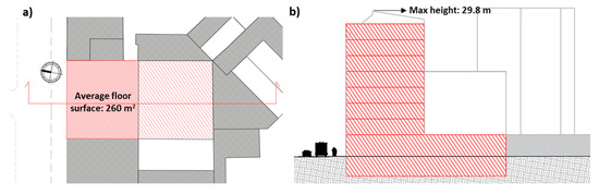 The case study is an eight-story hostel building, located in Milan, Italy, with a net average surface per floor above ground equal to about 260 m2, while the whole footprint area of the lot is around 600 m2 (Figure 2). The building comprises 280 beds distributed in different single and multiple bedrooms between the basement and the seventh floor. The basement is also partially occupied by service systems, while the ground floor is partially occupied by the reception and the common areas of the hostel. The eighth floor is occupied by a private penthouse of about 140 m2. Overall, the gross surface is around 2800 m2. The windows and transparent elements constitute around 30% of the whole vertical envelope.