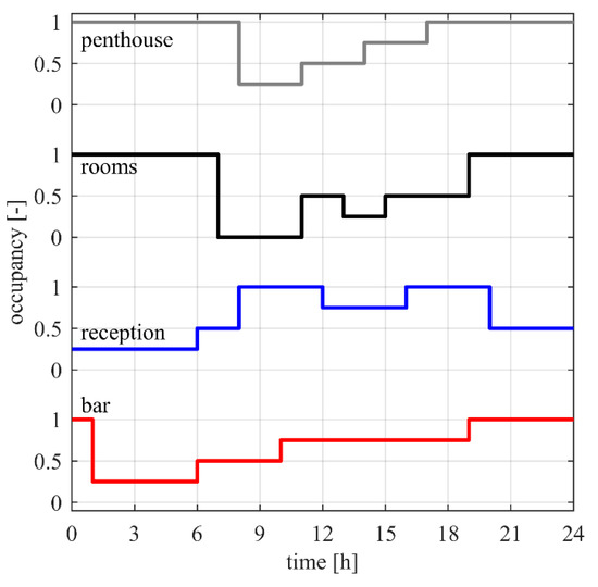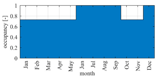 Taking into consideration the receptive function of the building (Figure 3), a yearly occupation profile was established, then a daily occupancy profile (Figure 4), and a heating/cooling plant schedule (Figure 5) was defined for each zone, according to the suggestions provided by the hostel manager who took part in the design process. As far as the heating and cooling plant activation was concerned, it is important to notice that the temperature control switches from a full set-point (20 °C in winter and 26 °C in summer) to a reduced one (18 °C in winter and 28 °C in summer). The effective occupation percentage of each zone at any given timestamp is obtained by multiplying the overall yearly occupation factor from Figure 3 by the thermal zone daily occupation factor from Figure 4.