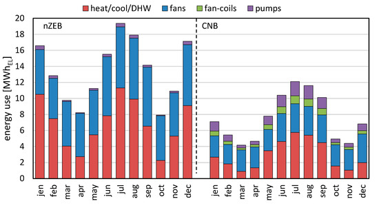 The energy delivered by the generation system was obtained, adding to the thermal energy needs all the losses related to the distribution, control, and emission systems, through the efficiencies reported in Table A2. Finally, the outcome of this process led to the monthly electrical energy uses reported in Figure 8. Concerning the annual values, a total electrical energy use of 161.60 MWhEL and 89.52 MWhEL was calculated for the nZEB and the CNB, respectively, corresponding to a 44.6% reduction.