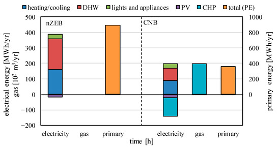 The overall energy production for both scenarios was computed. For the nZEB only, PVs were considered, while for the CNB, energy came from both the micro-CHP and PV panels. The overall energy production profile was, in both cases, subtracted from the corresponding energy use profile to finally get the total CO2-eq annual emissions.