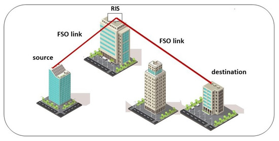 We considered an FSO RIS-ACs system over F-S TI fading channels. A simplified block scheme is presented in Figure 1. It was assumed that the RIS module ideally reflects the FSO signal and that the system is not influenced by pointing errors. The output symbol at the receiver y can be expressed as [24]: