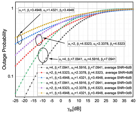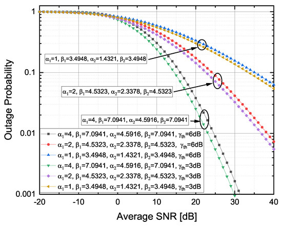 where was already derived in (23). It is important to note that was valid only for the integer values of , since was derived as a finite series expression. The numerical analysis of the OP for an FSO RIS-ACs system over Fisher–Snedecor TI fading channels was provided in the Numerical Results.