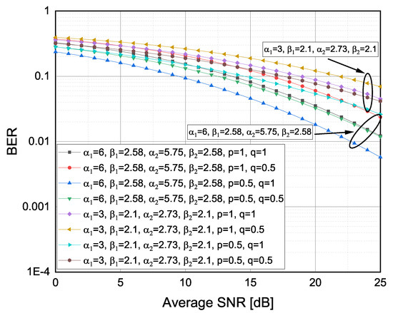 The average bit error rate () can be defined as the rate at which errors occur in the considered FSO RIS-ACs transmission system. The of the received SNR for various binary modulation techniques of the FSO RIS-ACs system in F-S TI fading propagation environment can be calculated using ([42], Equation (25)):