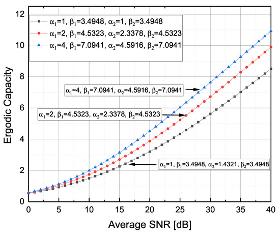 The ergodic channel capacity () of end-to-end SNR for the considered FSO RIS-ACs system that operates under the IM–DD modulation technique is given by ([24], Equation (31)):