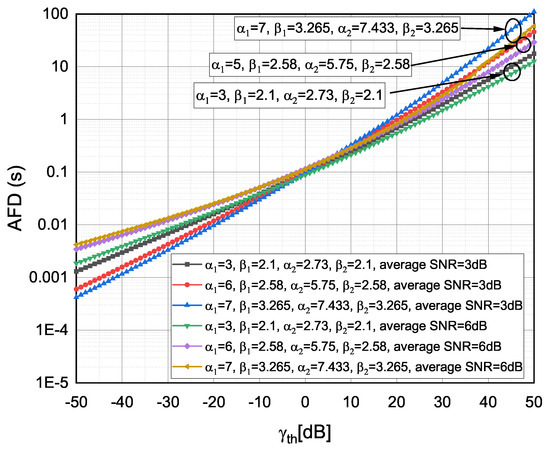 The level crossing rate () is defined as a time rate of change of the TI-faded signal in time-variant TI fading channels. For the predetermined SNR threshold , the can be written as ([32], Equation (14)):