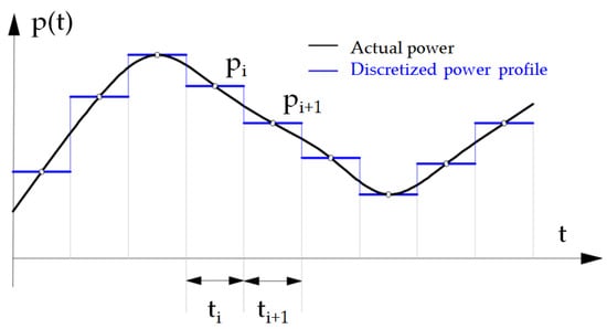 This paper aims at providing a formula free of such simplifications and, hence, able to render an improved evolution of the temperature of the cells over time, as well as the one of any other electrical variables intervening in the constant-power charging and discharging processes. This extension of the theoretical background can be useful to implement simple tools for the pre-design of the cooling system of SCs arrays, with a great potential to simplify the conduction of final experimental tests. It is important to point out that, even if the power profile imposed to the SC array is not constant, as in the example shown in Figure 1, it can always be discretized to a stepwise function, either using a fixed or variable time step, ti. Notice that if the power profile is measured to be used as an input for the design process, it will be typically obtained using digital data loggers. Thus, the raw data will inherently be provided in a stepwise format. Obviously, the shorter the discretization step the better the approximation to the actual power profile. By using the mathematical expressions provided in this paper, the temperature at the end of each time step can be straightforwardly obtained from the initial values of the same interval. Besides this generalization, there are a good number of industrial pieces of equipment, such as uninterruptible power supplies (UPSs), in which the SCs are typically commanded to provide grid support by feeding an essentially constant power to loads such as emergency lighting, electronic measurement devices, monitoring systems, etc. In these widespread applications, the estimation of the SCs temperature can be conducted directly for the full discharge process by using the analytical expressions presented in this paper. The proposed formulas can also be used to simplify the development of new control techniques for SCs arrays.