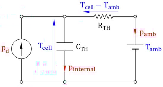The thermal model of the SC is based on the classical analogy with an electric circuit, as is shown in Figure 4 [33], where represents the power losses at the internal resistance of the cell, stands for the heat power losses, is the ambient temperature (considered constant), is the temperature of the cell, is the heat power that increases the thermal energy stored in the SC, and [°C/W] and [J/°C], respectively, are the thermal resistance and capacitance of the cell. Both and are usually provided by the manufacturer or can be calculated by conducting simple experimental tests.