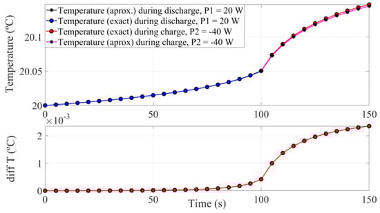 Top chart: Temperature of the cell obtained by using Equations (28)–(34) and the approximate equations given in [56] for discharge and charge at high power. Bottom chart: Temperature difference between both solutions.