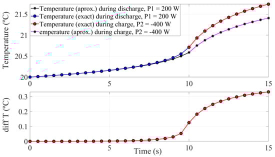 Top chart: Temperature of the cell obtained by using Equations (28)–(34) and the approximate equations given in [56] for discharge and charge at low or moderate power. Bottom chart: Temperature difference between both solutions.
