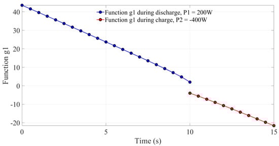 Figure 7 shows the evolution of the variable over time according to Equations (1) and (2). The values of are positive during the discharge, whereas they are negative in the charge.
