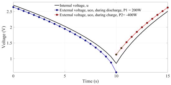 Figure 8 shows the evolution of the cell internal and external voltages over time according to Equations (1), (2), (6) and (35). The discontinuity that can be observed in the external voltage is due to the voltage drop at the internal resistance, as the reference of the current is reversed.