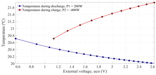 Figure 10 shows the evolution of the cell temperature as a function of the external voltage obtained from Equations (16), (28)–(30) and (36). As depicted in the graph, both variables increase during the charge, whereas the external voltage decreases and the temperature increases in the discharge.