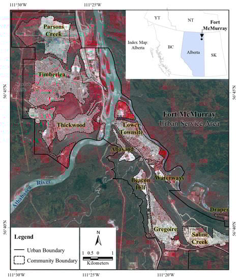 The study area is the communities of Fort McMurray urban service area in RMWB. Here, the service area and community boundaries are demarcated as solid and dotted lines, respectively over a WorldView-2 satellite image acquired on 6 June 2016. Dark greenish to gray colors in the image represent burned vegetation, and bright red to reddish colors as healthy vegetation. (adopted from Ahmed et al. [1] licensed under CC BY 4.0).