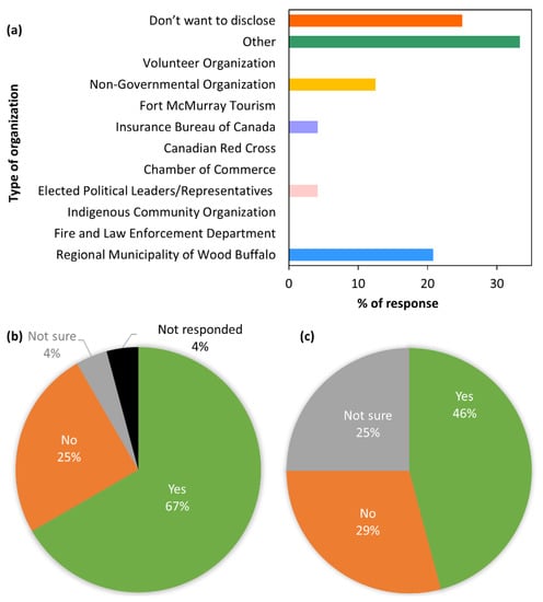 In order to make a plan for engaging the communities in this research, we prepared a list of 75 email addresses of potential participants involved in natural disaster management activities based on literature review (e.g., [47,48]) and public perceptions widely available in Alberta. These invited participants were from various organizations including Fire and Law Enforcement Department, Chamber of Commerce, Canadian Red Cross, Insurance Bureau of Canada, Fort McMurray Tourism, Elected Political Leaders, Non-Government Organizations (NGO), Voluntary Organizations, First Nations, and Métis Organizations. In the case of getting responses, we assumed to have a response rate of about 20% like other Canadian studies [49].