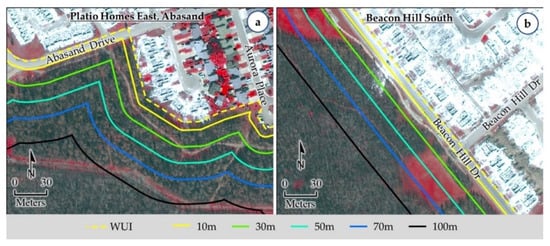 Relevant authorities removed vegetation between 30 and 70 m buffers from the WUI to protect the structures in the nearby Timberlea community (a), and existence of dense vegetation as shown in reddish color within 10 to 70 m from the WUI after the 2016 HRF event, and it was identified as vulnerable areas (b). (Source: ©Ahmed et al. 2018 licensed under CC BY.).