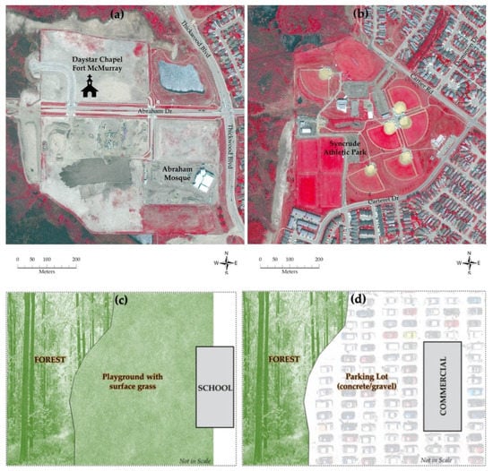 Parking lots and/or surface grassland facing towards the forested areas of major social infrastructures, including: religious establishments (a), athletic parks/arenas (b), school buildings (c), and commercial entities (d).