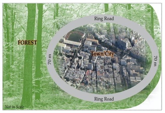 A schematic ring road with a width of about 70 m around a community that may potentially reduce wildland fire-induced risks.